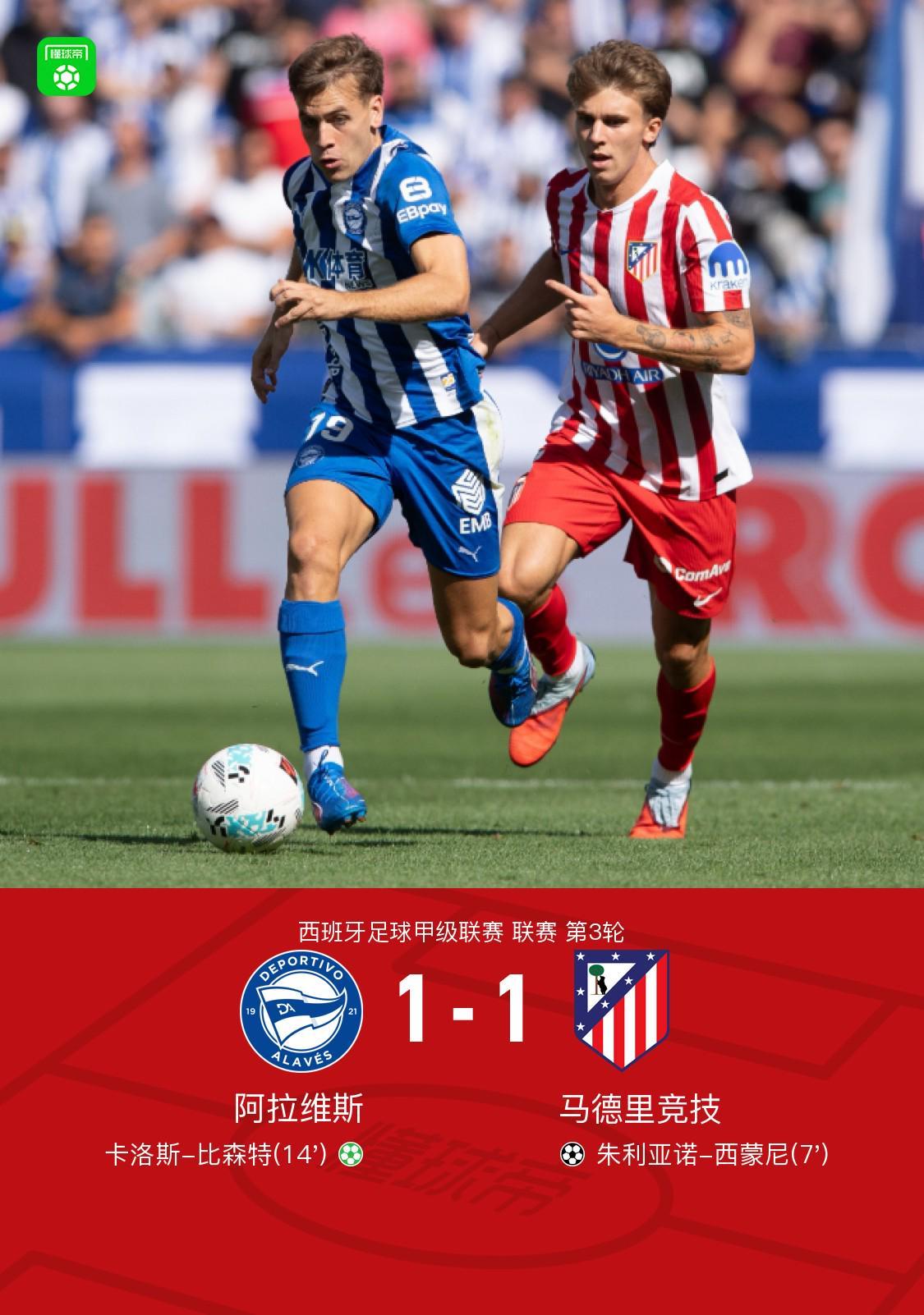 8月30日,西班牙足球甲级联赛第3轮,阿拉维斯坐镇主场迎战马德里竞技。比赛中,马德里竞技球员朱利亚诺-西蒙尼率先破门,为客队取得领先。随后,阿拉维斯球员卡洛斯-比森特通过点球机会扳平比分。最终双方以1-1握手言和。